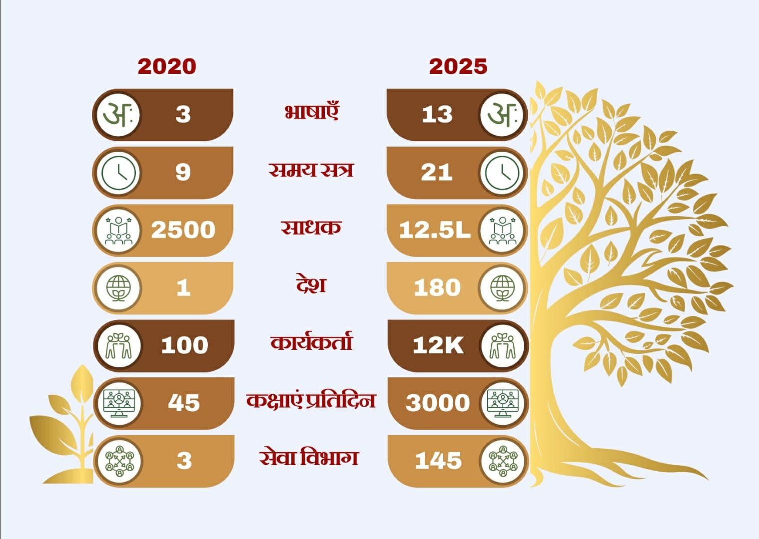 2500 साधकों और 1000 कार्यकर्ताओं से प्रारंभ हुई यह साधना-यात्रा, आज 12 लाख साधकों और 12 हजार समर्पित कार्यकर्ताओं के विराट स्वरूप में विकसित हो चुकी है। और अद्भुत यह कि – अधिकांश एक-दूसरे को जानते तक नहीं, फिर भी इस मंच पर सभी परिवार की तरह घुल-मिल गए हैं। भारत ही नहीं, विश्व के कोने-कोने से साधक और सेवी इस गंगा में आचमन करने चले आ रहे हैं — और यह प्रवाह अविराम है।