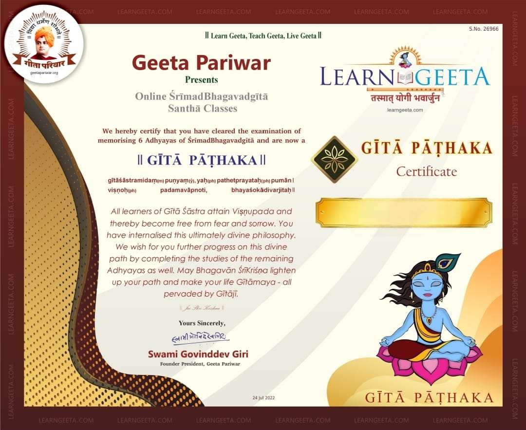 - सभी 18 अध्यायों को कंठस्थ कर ऑनलाइन परीक्षा दी जाती है। परीक्षा उत्तीर्ण होने पर पदक और “गीता व्रती” प्रशस्तिपत्र से सम्मानित किया जाता है।